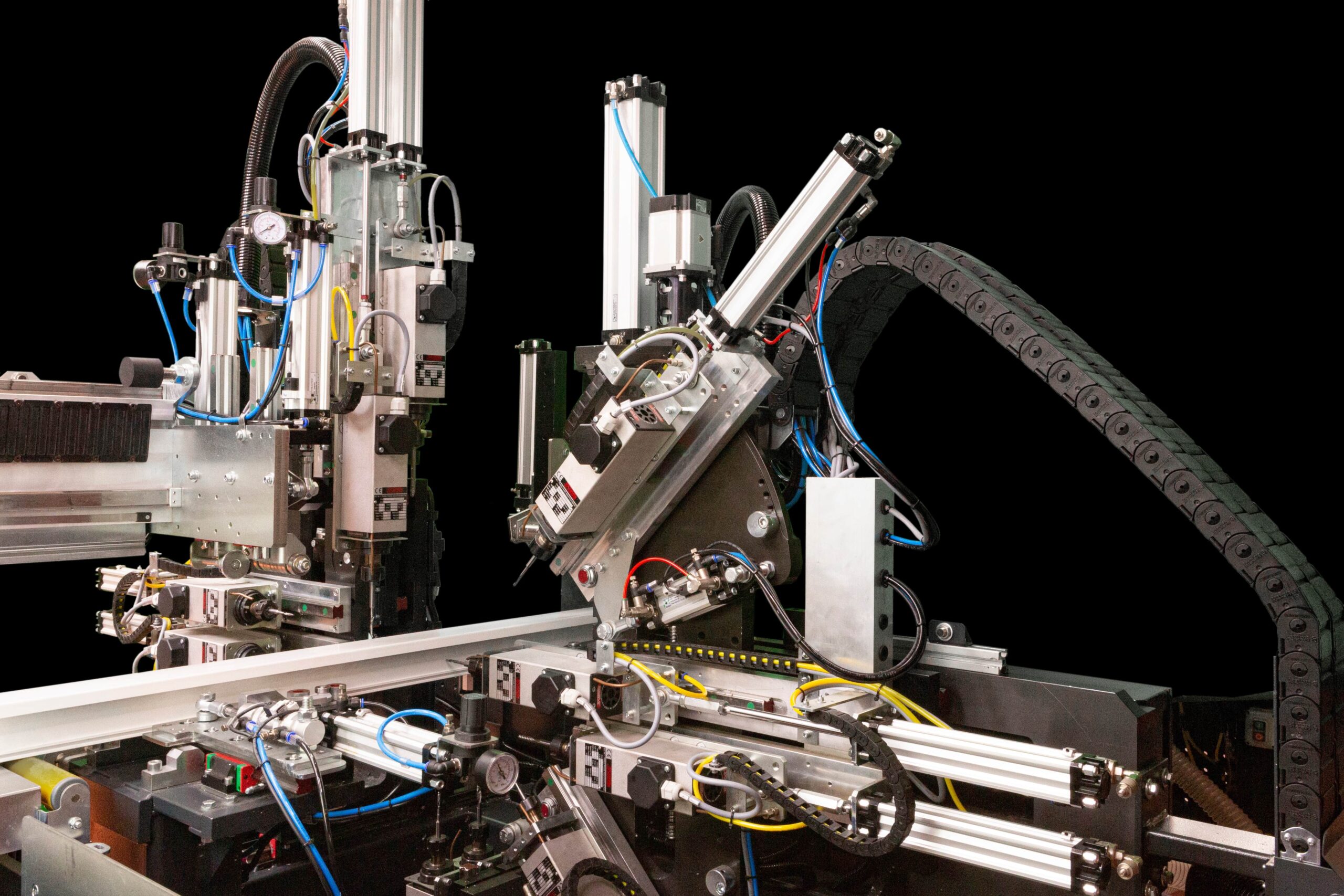 O FAB CUT 3BS realiza todos os processos padrão e especiais do setor de esquadrias em PVC, com dois módulos de trabalho independentes, equipados no total com 11 mandris de alta velocidade. O módulo de corte horizontal com 3 lâminas Ø550 mm permite cortes a -45° / 90° / +45°, mesmo em perfis com vedação.